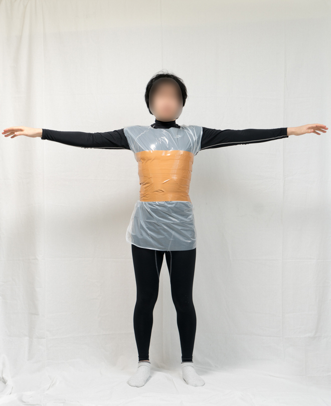 最后是下半身。这边也同样使用保鲜膜或是塑料袋来包复。 这边要注意的是跨下的部分。虽然是敏感部位所以固定时会有些尴尬 但如果包得太松的话鼠蹊部会降得太低,尺寸也会整个不同。