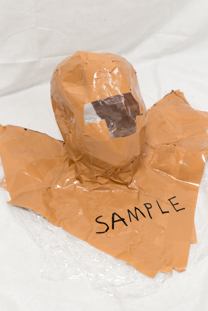 Start rolling out the wrapping paper as seen above. Make sure to make a hole in the nose and mouth in order to breathe.